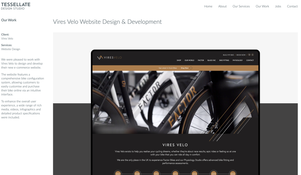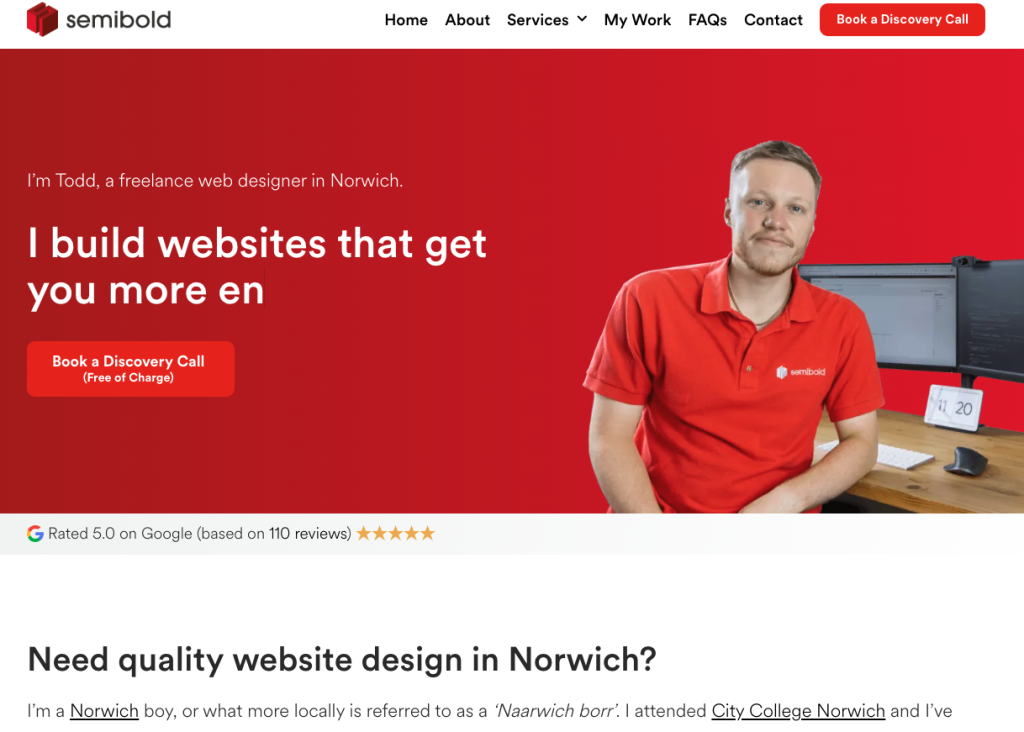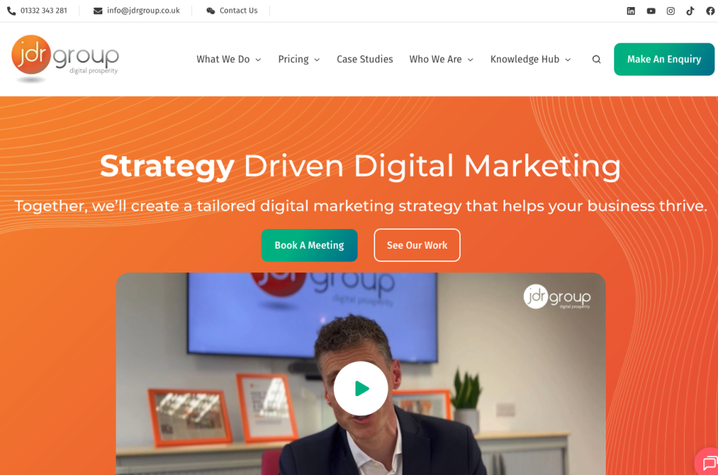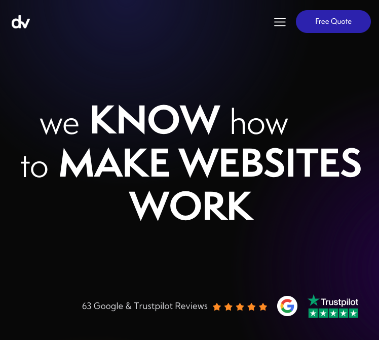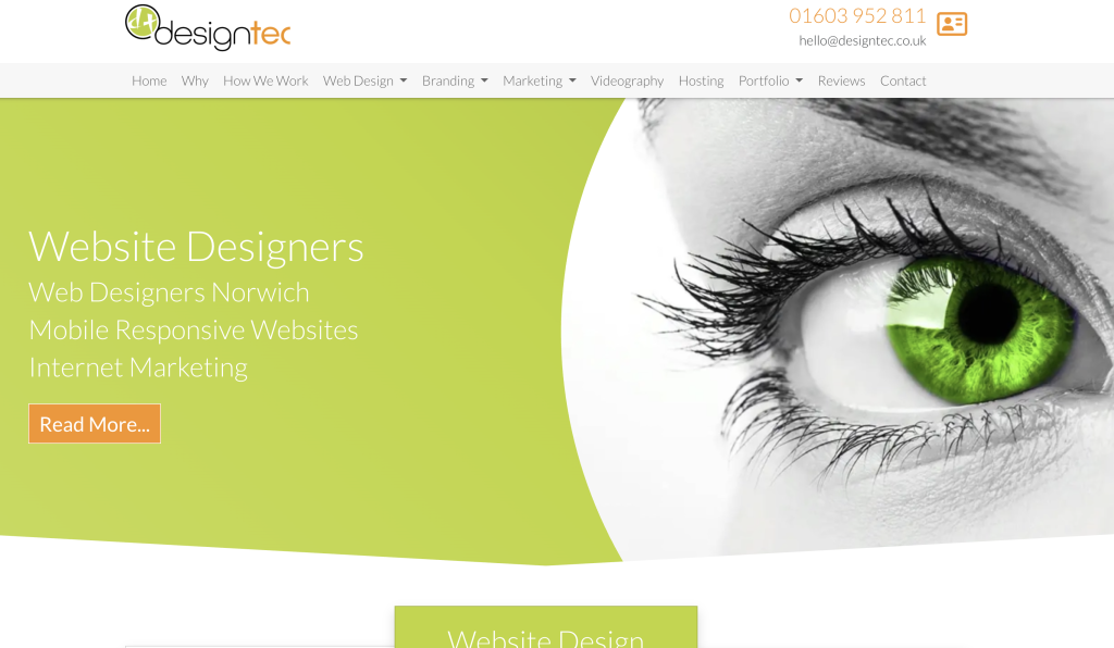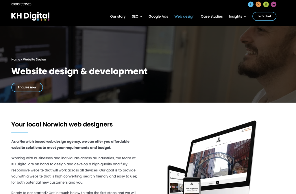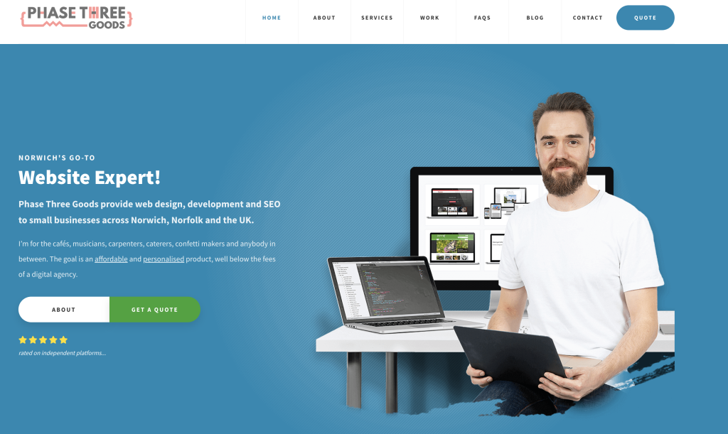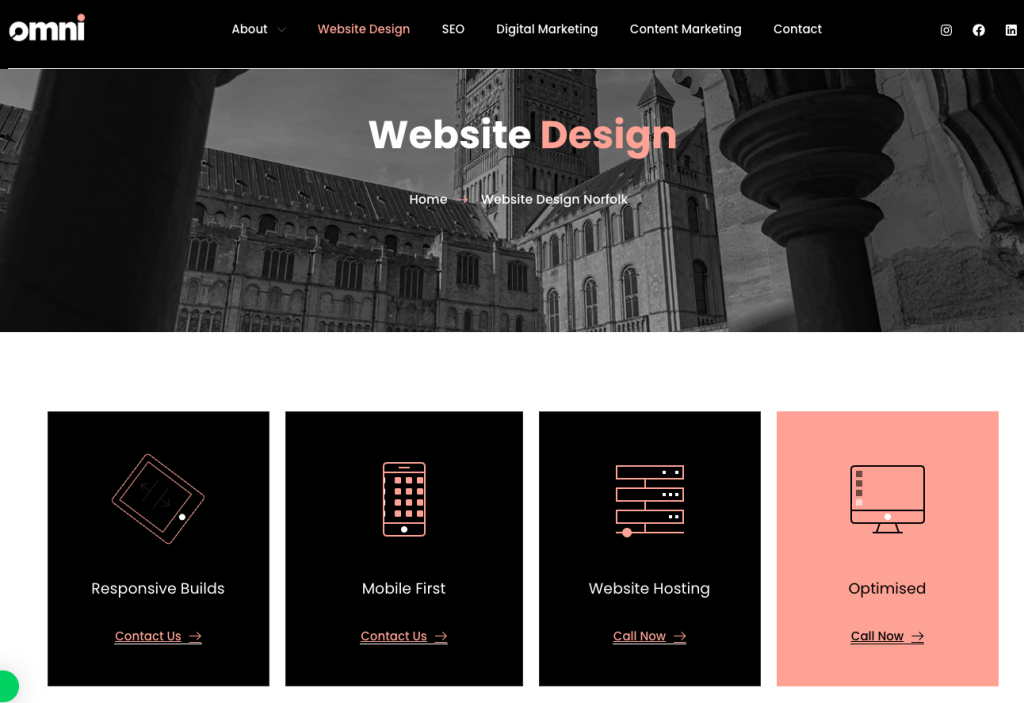 These guys are the first so far to offer clear packages and pricing. So for a one page site that’ll be £300 but won’t include much. I think, personally, they should promote the videography more since that’s got more of a moat than web dev and is a nice addition to their website that most can’t offer. Website is clean and white; tiny bit blocky I would go for more whitespace. But overall decent site.