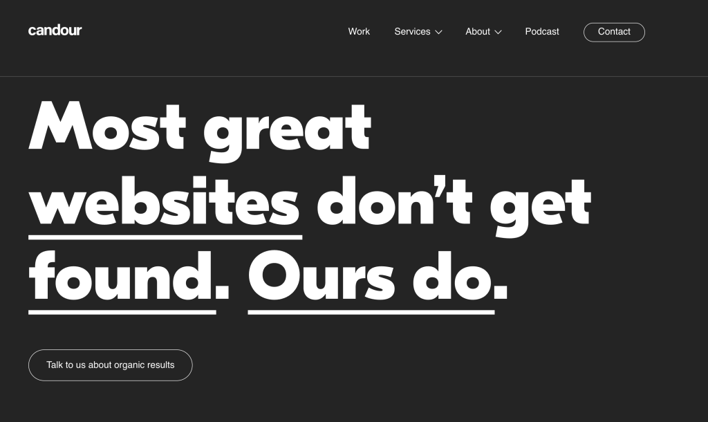 Before I get super tired after hours of looking at all these, I’ve got a few more. Candour are all about marketing based on solid SEO experience. They do a weekly podcast. Nice branding. Clear communication with enough detail.